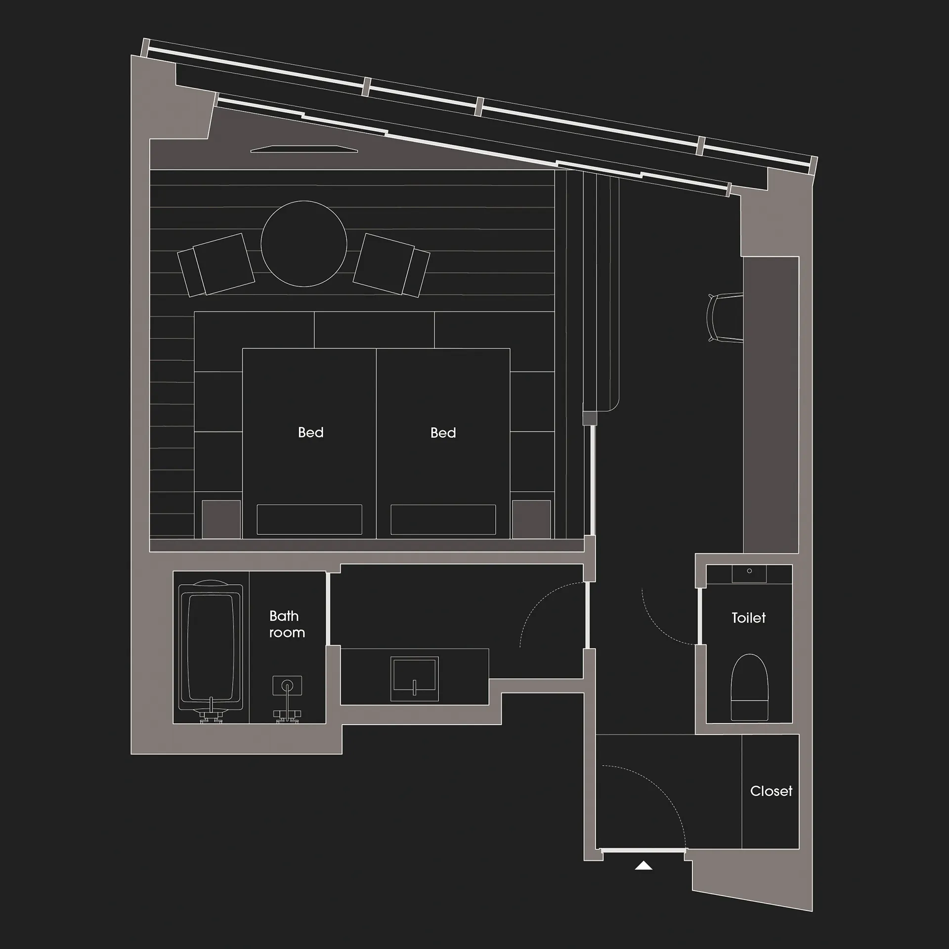 日本の自然素材の風合いとアートが調和する、落ち着いた客室。 小上がりとソファを取り入れ、日本の趣を感じられる心やすらぐ空間に仕上げました。 ダブルベッド2台と浴槽付きバスルームを備え、最大2名さまでご滞在いただけます。 大切な人とのひとときを、快適にお過ごしください。